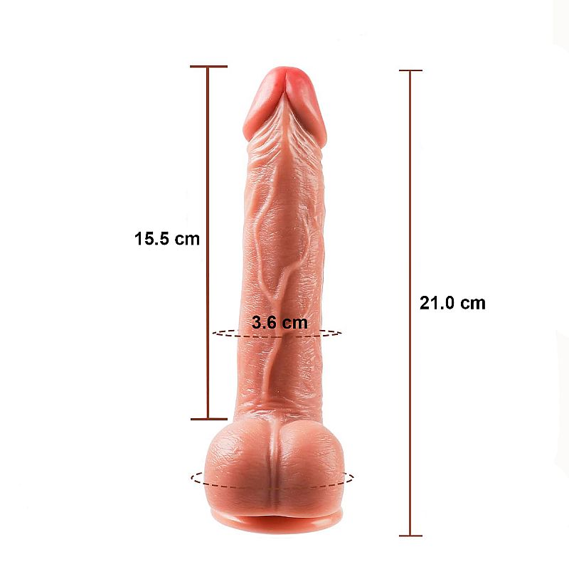 Com 21,0 cm de comprimento total (15,5 cm penetráveis) e 3,6 cm de espessura, oferece prazer na medida certa, seja no uso anal ou vaginal.